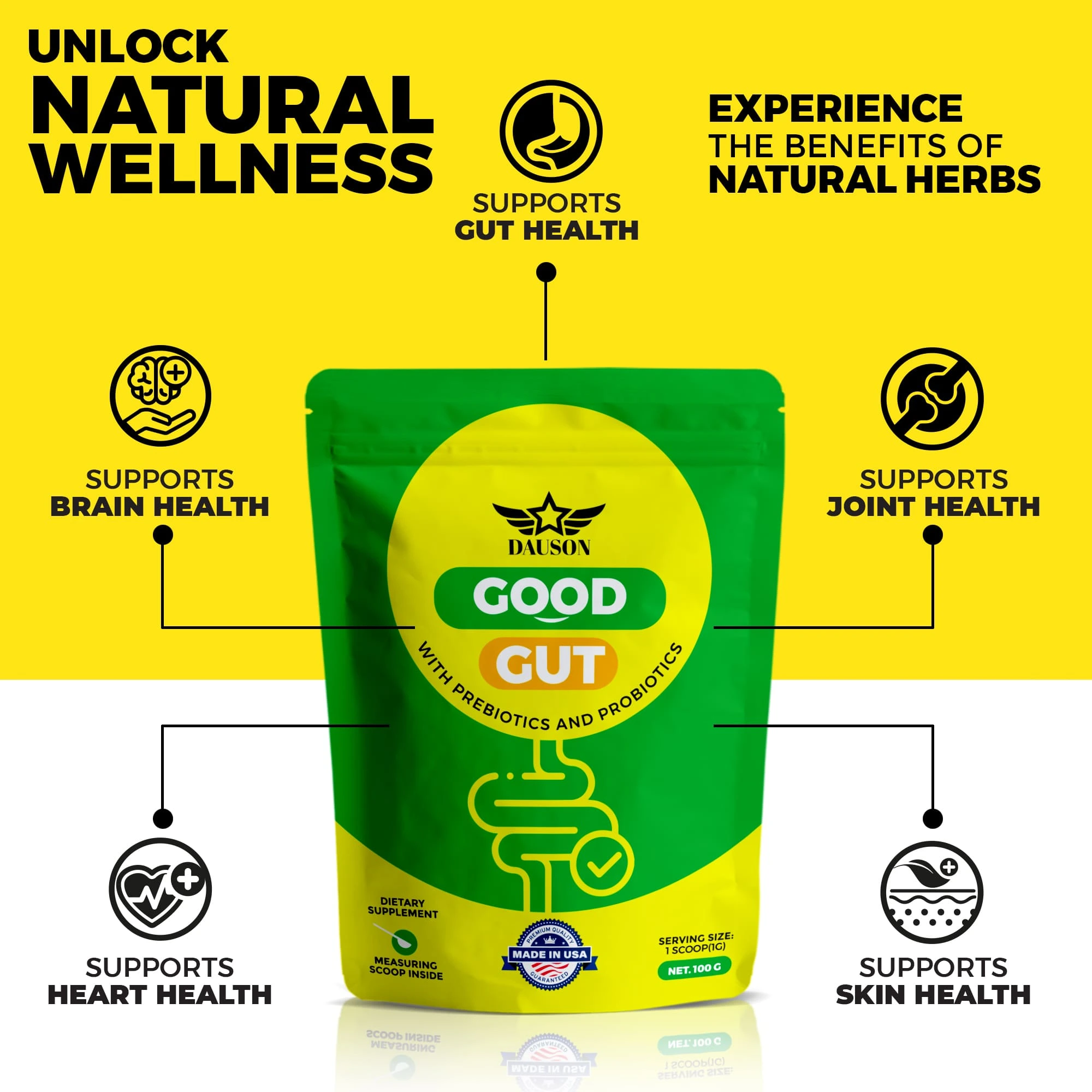 DAUSON Good Gut Powder is a thoughtfully formulated herbal supplement created to support digestive comfort and overall gut wellness as part of a balanced daily routine. This blend combines prebiotics, probiotics, and traditional herbal ingredients selected for everyday use.