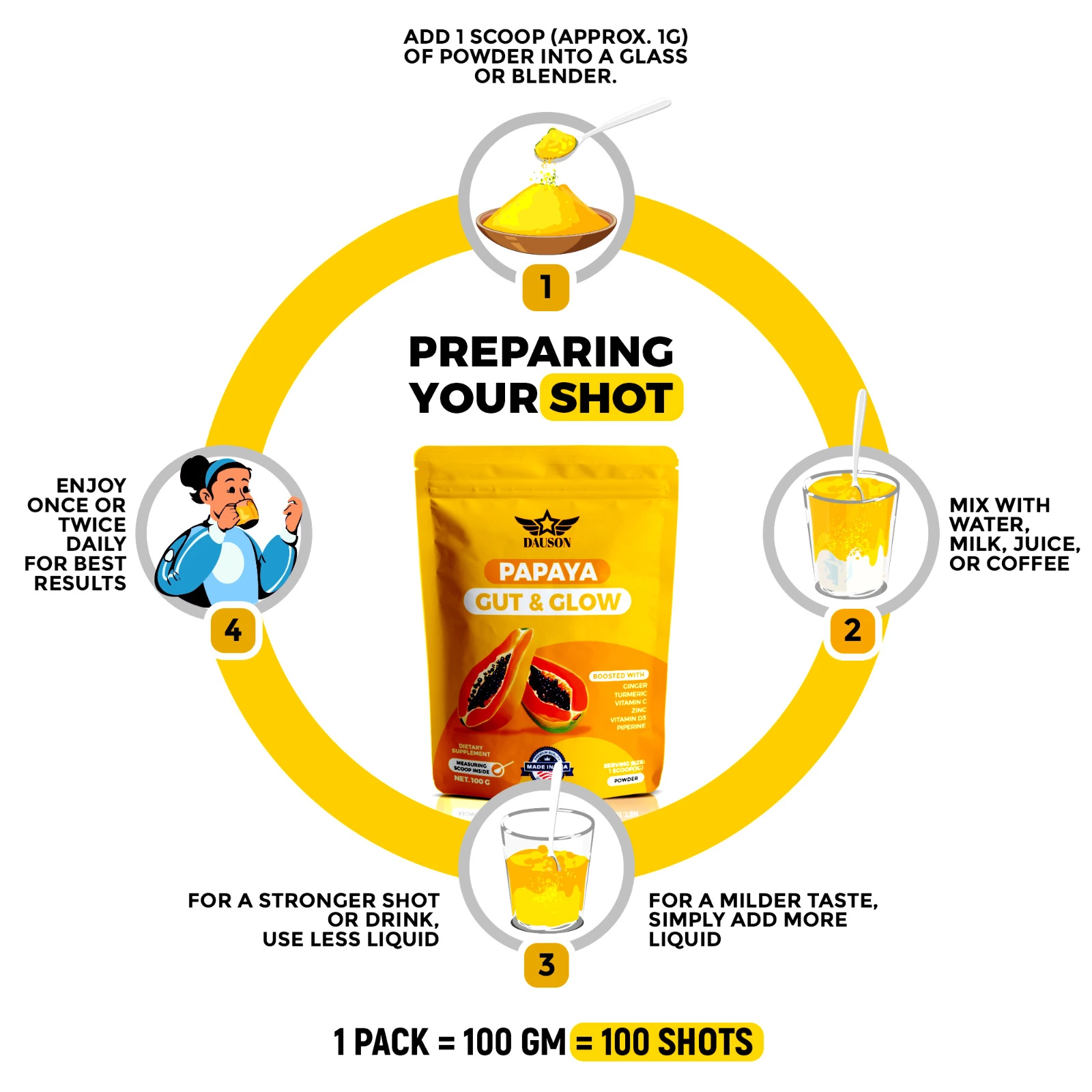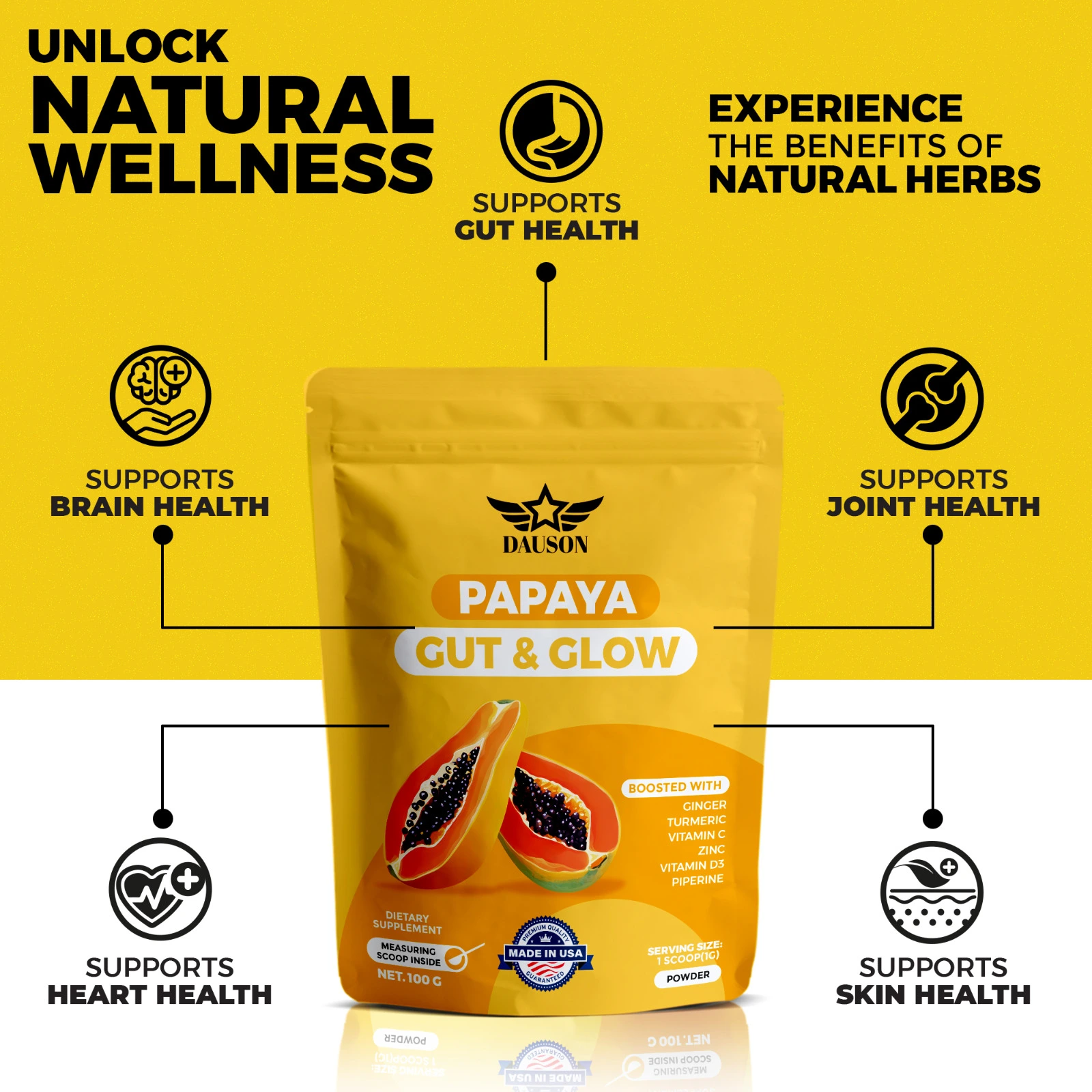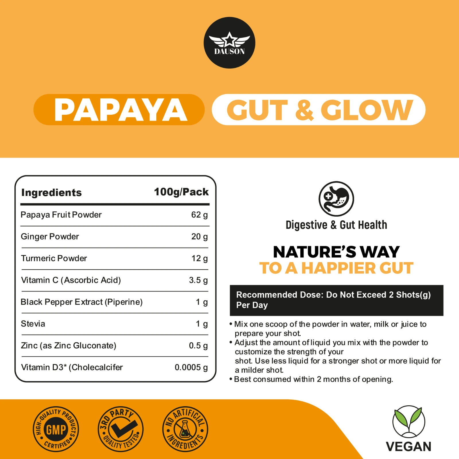 DAUSON Papaya Gut & Glow Powder is a carefully formulated blend designed to support digestive comfort and overall daily balance. It combines papaya fruit powder with ginger and turmeric, along with essential nutrients such as Vitamin C, Zinc, and Vitamin D3 to create a well-rounded supplement for regular use.